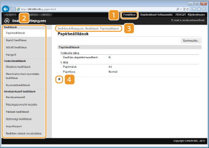 megjeleníti a [Beállítások/Bejegyzés] oldalt. Ha rendszerkezelő módban jelentkezett be, akkor módosíthatja a beállításokat, illetve mentheti/betöltheti a bejegyzett adatokat.