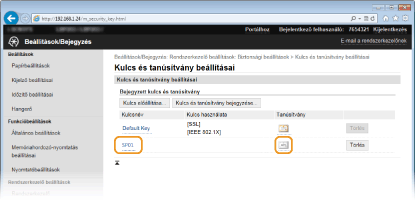 Ha egy adott kulcspárt használ valamilyen funkció, például a [Kulcs használata] mezőben a "TLS" vagy az "IEEE 802.1X" látható, akkor a kulcspár nem törölhető. Ebben az esetben a kulcspár törlése előtt ki kell kapcsolni a funkciót, vagy le kell cserélni a kulcspárt.