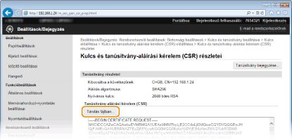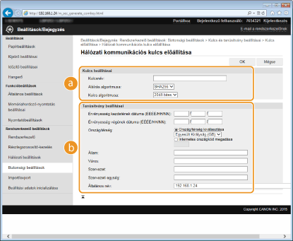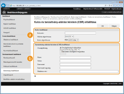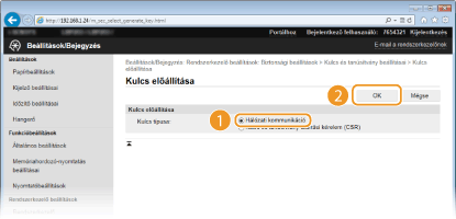 Ha a TLS (Transport Layer Security) protokollal folytatott titkosított kommunikációhoz kulcspárra van szükség, akkor az előállítható a készülékkel. A TLS protokollt a készülék Távoli felhasználói felületen keresztüli elérésekor használhatja. A készülékre legfeljebb öt kulcspár jegyezhető be, beleértve az előre telepített kulcspárt is. Az önaláírt tanúsítványok a „Hálózati kommunikáció” típussal létrehozott kulcspárokkal használhatók. A „Kulcs és tanúsítvány-aláírási kérelem (CSR)” esetében a készülékkel létrehozott kulcspárhoz kérhet hitelesítésszolgáltató által kiállított digitális tanúsítványt.