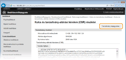 A tanúsítvány aláírási kérelmével (CSR) létrehozott kulcspár nem használható, amíg végre nem hajtja a bejegyzését. Miután a hitelesítésszolgáltató kiadta a digitális tanúsítványt, jegyezze be azt az alábbi művelet végrehajtásával.