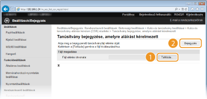 Kattintson a [Browse] (Tallózás) elemre, adja meg a fájlt a tanúsítvány-aláírási kérelemhez, majd kattintson a [Bejegyzés] gombra.