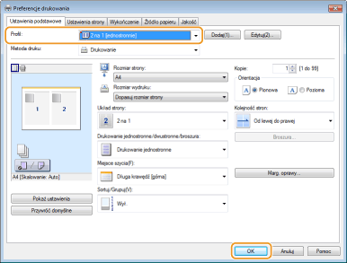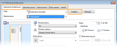 Określanie kombinacji ustawień, jak np. drukowanie „1-stronne w orientacji poziomej na papierze w formacie A4” przy każdym drukowaniu, może być czasochłonne. Jeśli często używane kombinacje ustawień wydruku zostaną zarejestrowane jako „profile”, skonfigurowanie ustawień wydruku będzie wymagało jedynie wybrania profilu z listy. W tej sekcji opisany został sposób rejestracji profili i drukowania za ich pomocą.