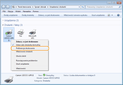 Kliknij prawym przyciskiem myszy ikonę drukarki, a następnie kliknij pozycję [Printing preferences] (Preferencje drukowania).