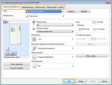 Kliknij kolejno zakładki [Ustawienia podstawowe], [Ustawienia strony], [Wykończenie], [Źródło papieru] lub [Jakość], aby skonfigurować ustawienia wydruku na każdym ekranie w zależności od potrzeb.