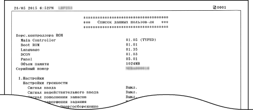 <Список данных пользователя> не включает списки настроек для <Настройки сети> и <Настройки управления системой>. Для проверки всех элементов настроек, включая <Настройки сети> и <Настройки управления системой>, напечатайте <Список данных администратора системы>.