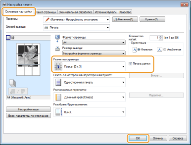 Отметьте флажком пункт [Печать рамки], чтобы добавить границы для печатаемых копий. Границы могут пригодиться в случае, если вы хотите склеить копии или отрезать поля.