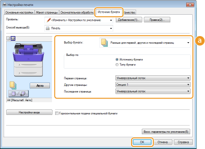 Можно печатать первую, основные и последнюю страницы на разных типах бумаги. Например, вы можете задать, чтобы для печати первой страницы ([Первая страница]) использовалась бумага, находящаяся в универсальном лотке, для печати основных страниц ([Другие страницы]) — бумага, находящаяся в кассете для бумаги, а для печати последней страницы ([Последняя страница]) — бумага, находящаяся в универсальном лотке. Кроме того, указав значение [Типу бумаги] для параметра [Выбор по], вы можете задать, чтобы бумага для печати выбиралась по ее типу, а не по источнику.