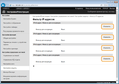 При неправильном вводе IP-адресов доступ к аппарату из Удаленного ИП может быть невозможен. В этом случае необходимо установить для <Фильтр IPv4-адресов> или <Фильтр IPv6-адресов> значение <Выкл.>. Фильтр IPv4-адресов Фильтр IPv6-адресов