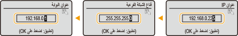 <قناع الشبكة الفرعية> <عنوان البوابة>.أدخل كل إعداد باستخدام المفاتيح الرقمية واضغط على