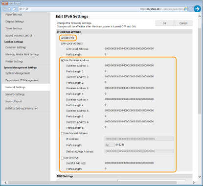 يمكن تكوين عناوين IPv6 الخاصة بالجهاز من خلال Remote UI (واجهة المستخدم البعيدة). وقبل تعيين عناوين IPv6، تحقق من صحة إعدادات عناوين IPv4 (مشاهدة إعدادات IPv4). ويلزم تعيين إعدادات IPv4 الصحيحة لاستخدام عناوين IPv6. ويمكن أن يستخدم الجهاز ما يصل إلى تسعة من عناوين IPv6 التالية:
