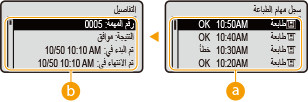 .![]() <سجل مهام الطباعة>يعرض قائمة بالمستندات التي تمت طباعتها. يتم عرض <OK> عندما تنجح عملية طباعة مستند، ويتم عرض <خطأ> عندما تفشل عملية طباعة مستند نتيجة لإلغائها أو لوجود خطأ ما.