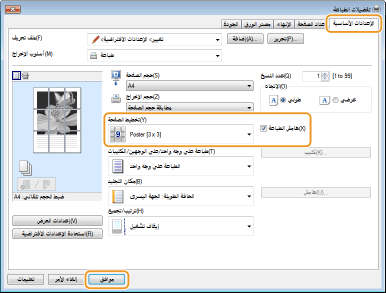 يمكنك طباعة صفحة واحدة من مستند على عدة صفحات. على سبيل المثال، إذا قمت بإنشاء مستند بحجم A4 يتألف من صفحة واحدة بمقدار تسعة أضعاف الحجم الأصلي، فسوف يكون لديك ملصق كبير مقاس ٣x٣ لأوراق بحجم A4 بعد طباعة المستند ولصقها معًا.