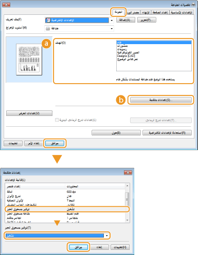 في الشاشة [إعدادات متقدمة]، يمكنك تحديد إعدادات الطباعة المختلفة بخلاف إعدادات توفير الحبر. لمزيد من المعلومات، انقر فوق [تعليمات] على شاشة برنامج تشغيل الطابعة.