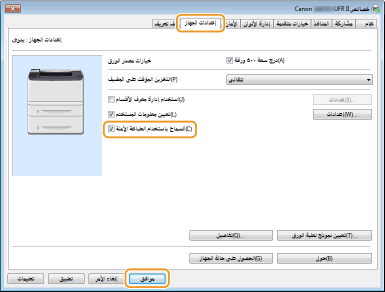 انقر علامة التبويب [إعدادات الجهاز] وتأكد من اختيار مربع الاختيار [السماح باستخدام الطباعة الآمنة].