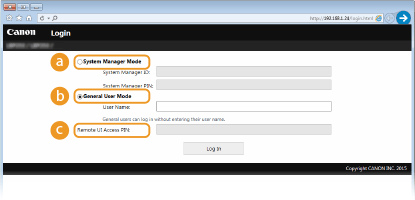 يمكنك تنفيذ جميع عمليات تشغيل وإعدادات واجهة المستخدم عن بعد Remote UI. قم بإدخال رمز التعريف ID الملائم في [System Manager ID] ورمز المرور PIN في [System Manager PIN] (