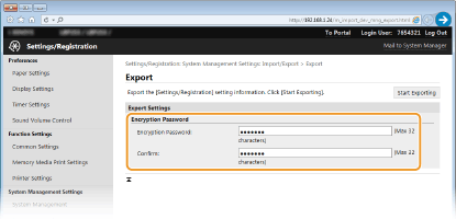 أدخل كلمة مرور للتشفير تصل إلى ٣٢ رمزًا أبجديًا رقميًا. أدخل كلمة المرور ذاتها في [Confirm]. لتصدير البيانات، يجب أن تضبط كلمة مرور للتشفير.