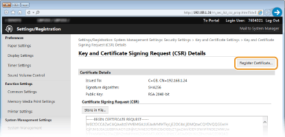 يمكن للجهاز توليد زوج مفاتيح عندما يكون ضروريًا للاتصال المشفر عبر بروتوكول أمن طبقة النقل (TLS). ويمكنك استخدام بروتوكول TLS عند الدخول إلى الجهاز من واجهة المستخدم عن بعد Remote UI. يمكن تسجيل حتى خمسة أزواج مفاتيح بما فيها الأزواج المثبتة مسبقًا. يتم استعمال الشهادات ذاتية التوقيع مع أزواج المفاتيح المستحدثة في "Network Communication". بواسطة "Key and Certificate Signing Request (CSR)"، يمكنك طلب الحصول على الشهادة الرقمية الصادرة من هيئة الشهادات لزوج المفاتيح المستحدث بواسطة الجهاز.