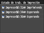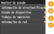 , aparece una pantalla que le permite consultar el estado del documento que se está imprimiendo, así como el estado del equipo (cantidad restante en el cartucho de tóner, etc.) o información sobre la configuración de la red, como la dirección IP del equipo.