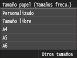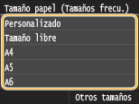 Si la pantalla anterior no aparece cuando hay papel cargadoSi siempre carga el mismo papel en la bandeja multiuso, puede omitir las operaciones de configuración del papel registrando el tamaño y el tipo de papel como opción predeterminada. Sin embargo, si se registra la opción predeterminada, la pantalla anterior no aparecerá. Para visualizar la pantalla, seleccione <Especificar cuando cargue papel> (Registro de las opciones de papel predeterminadas para la bandeja multiuso).