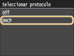 Pulse <Off>. Si pulsa <DHCP> cuando estos servicios no están disponibles, el equipo desperdiciará tiempo y recursos de comunicaciones buscando estos servicios en la red.