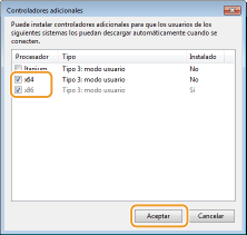 Esta operación es necesaria si desea instalar controladores de impresora en otros ordenadores con una arquitectura de bits diferente a través del servidor de impresión.