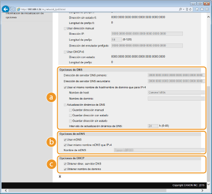 Seleccione la casilla de verificación para utilizar el mismo nombre de mDNS que en IPv4. Para configurar un nombre diferente, quite la marca de la casilla de verificación e introduzca el nombre de mDNS en el cuadro de texto [Nombre de mDNS]. [Opciones de DHCP][Obtener direc. servidor DNS]