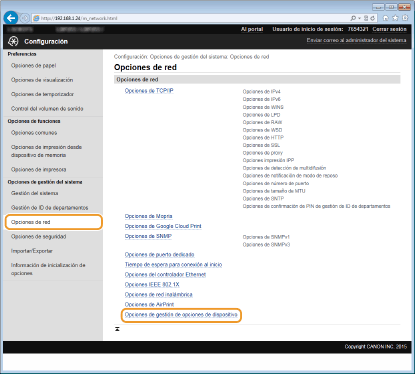Uso del panel de controlTambién puede configurar las opciones de administración de opciones de dispositivos desde <Menú> en la pantalla Inicio. Activar/desactivar gestión de opciones de dispositivo