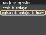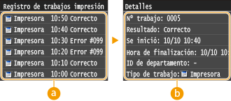 ![]() <Registro de trabajos impresión>Muestra una lista de los documentos que se han impreso.Correcto> aparece cuando un documento se imprime correctamente, y <Error> aparece cuando un documento no se imprime correctamente porque se canceló o se produjo algún error.