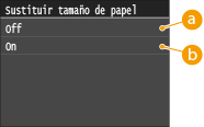 Sustituye el tamaño de papel. Sin embargo, si no hay papel de sustitución en ninguno de los orígenes del papel, no podrá llevarse a cabo la sustitución.