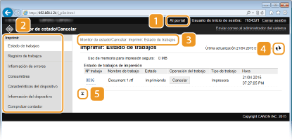Muestra la página [Monitor de estado/Cancelar]. Puede usar esta página para comprobar el estado de impresión actual, cancelar la impresión y ver un historial de los trabajos de impresión.