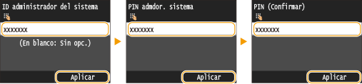 ![]() La configuración predeterminada de fábrica tanto del ID del administrador del sistema como del PIN es "7654321". Tenga en cuenta que, por motivos de seguridad, es preferible no usar estos valores. Se recomienda cambiar estos valores mediante el siguiente procedimiento.