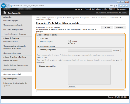 Si las direcciones IP se introducen de forma incorrecta, es posible que no pueda acceder al equipo desde la IU Remota, en cuyo caso deberá establecer <Filtro de direcciones IPv4> o <Filtro de direcciones IPv6> en <Off>. Filtro de direcciones IPv4 Filtro de direcciones IPv6