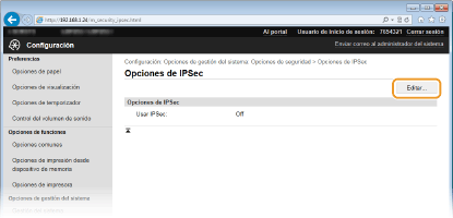 Uso del panel de controlTambién podrá activar o desactivar la comunicación IPSec desde <Menú> en la pantalla Inicio. Usar IPSec