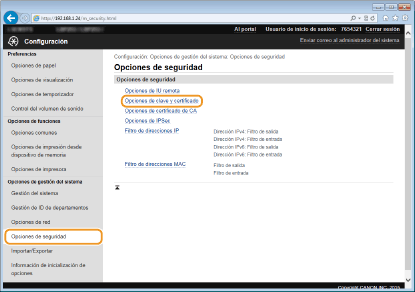 No se puede eliminar ningún par de claves si se está utilizando para algún fin, como cuando aparece "TLS" o "IEEE 802.1X" en [Uso de clave]. En este caso, deshabilite la función o sustituya el par de claves antes de eliminarlo.