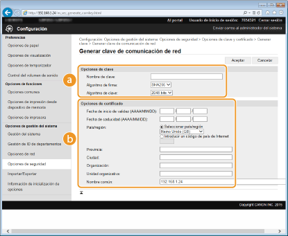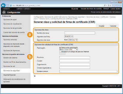 Los pares de claves pueden generarse con el equipo en caso necesario para la comunicación cifrada a través de la Seguridad de capa de transporte (Transport Layer Security, TLS). Podrá utilizar TLS para acceder al equipo a través de la IU remota.Podrán registrarse hasta cinco pares de claves, incluidas las que están preinstaladas. Los certificados autofirmados se utilizan con pares de claves generados en la "Comunicación de red".Con una "Clave y solicitud de firma de certificado (CSR)", podrá solicitar un certificado digital emitido por la autoridad de certificación (CA) para el par de claves generado por el equipo.
