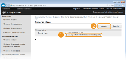 Seleccione [Clave y solicitud de firma de certificado (CSR)] y haga clic en [Aceptar].