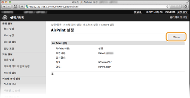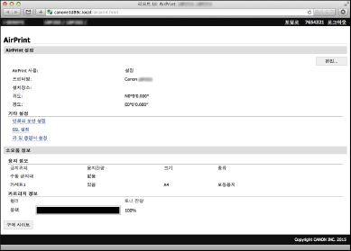 기기명과 설치 위치를 비롯하여, 기기 식별에 이용되는 정보를 등록할 수 있습니다. 기기의 AirPrint 기능을 비활성화할 수도 있습니다. 이러한 설정을 변경하려면 리모트 UI를 사용하십시오.