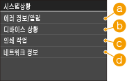 를 누르면 인쇄 중인 문서의 상태를 비롯하여 기기의 상태(토너 카트리지 잔량 등)나 기기의 IP 주소와 같은 네트워크 설정 정보를 확인할 수 있는 화면이 표시됩니다.