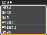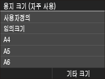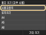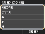 용지가 적재되었는데 상기 화면이 나타되지 않을 경우다목적 트레이에 항상 같은 용지를 넣는 다면, 용지 크기 및 종류를 기본 설정으로 등록하여 용지 설정 과정을 건너 뛸 수 있습니다. 그러나 기본 설정이 등록되면 상기의 화면은 표시되지 않습니다. 이 화면을 표시하려면 <용지 세트시 지정> (다목적 트레이에 대해 기본 용지 설정 등록)을 선택하십시오.