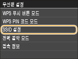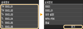 보안 설정무선 라우터를 선택하여 무선 연결을 설정하면 WEP 인증 방법이 <오픈 시스템>으로 설정되거나 WPA/WPA2 암호화 방법이 <자동>(AES-CCMP 또는 TKIP)으로 설정됩니다. WEP 인증에 대해 <공유키>를 선택하거나 WPA/WPA2 암호화에 대해 <AES-CCMP>를 선택하려면 수동 입력 방법을 사용하여 연결을 설정해야 합니다(세부 설정을 지정하여 연결 설정).