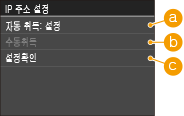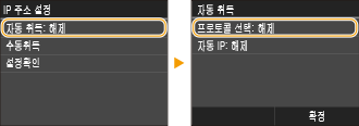 ![]() <설정>이 표시되면, <자동 취득>을 누르고 <프로토콜 선택>과 <자동 IP>를 모두 <해제>로 설정합니다.