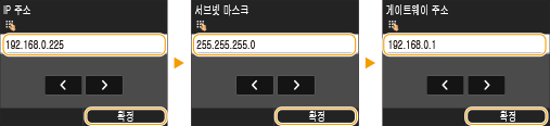 <서브넷 마스크> <게이트웨이 주소>.숫자 키를 눌러 각 설정을 입력하고 <확정>을 누릅니다.