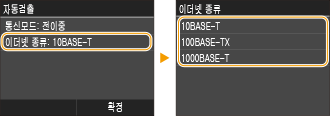 이더넷 유형을 선택합니다.![]() ![]() <통신모드>가 <반이중>로 설정된 경우 <1000BASE-T>를 선택할 수 없습니다.