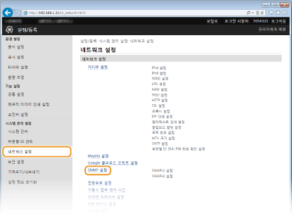 홈 화면의 <메뉴>에서 SNMP 설정을 활성화하거나 비활성화할 수 있습니다. SNMP 설정