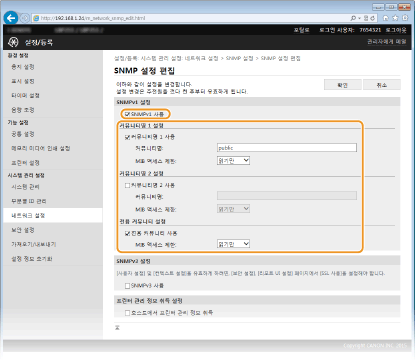 SNMP(Simple Network Management Protocol)는 MIB(Management Information Base)를 사용하여 네트워크의 통신 장치를 모니터링하고 제어하기 위한 프로토콜입니다. 본 기기는 SNMPv1 및 보안 기능이 개선된 SNMPv3을 지원합니다. 문서를 인쇄하거나 리모트 UI를 사용할 때 컴퓨터에서 기기의 상태를 확인할 수 있습니다. SNMPv1 또는 SNMPv3를 각각 또는 동시에 모두 활성화할 수 있습니다. 네트워크 환경과 사용 목적에 맞게 각 버전의 설정을 지정합니다.