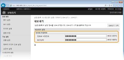 최대 32자의 영숫자 문자로 구성된 암호화 비밀번호를 입력합니다. 같은 암호를 [확인입력]에 입력합니다. 데이터를 내보내려면 암호화 비밀번호를 설정해야 합니다.