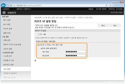 이 확인란을 선택한 경우, 리모트 UI에 액세스하려면 PIN을 입력해야 합니다.