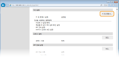 TLS(Transport Layer Security)를 사용하여 기기와 컴퓨터 웹 브라우저 간의 통신을 암호화할 수 있습니다. TLS는 네트워크를 통해 송수신되는 데이터를 암호화하기 위한 메커니즘입니다. IPSec (사전 공유키 방식), IEEE 802.1X 인증(TTLS/PEAP) 또는 SNMPv3에 대한 설정을 지정하는 데 리모트 UI를 사용하는 경우에는 TLS를 반드시 활성화해야 합니다. 리모트 UI에 대해 TLS를 사용하려면 키 쌍을 설정하고 TLS 기능을 활성화해야 합니다. TLS를 활성화하기 전에 TLS에 대한 키 쌍을 생성하거나 설치하십시오 (