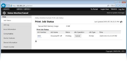 The Remote UI allows you to manage the machine remotely from the computer at your desk. You can check the remaining amounts of paper and toner cartridge, and check the current status of print jobs to decide if you should temporarily interrupt print jobs to print urgent documents or move documents up among the jobs waiting to be printed. Save time and trouble by eliminating trips between your desk and the printer.