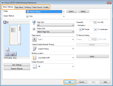 Click the [Basic Settings], [Page Setup], [Finishing], [Paper Source], or [Quality] tabs to specify the print settings on each screen as necessary.